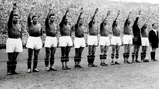 Os italianos fazendo a saudação fascista antes dos jogos em 34.